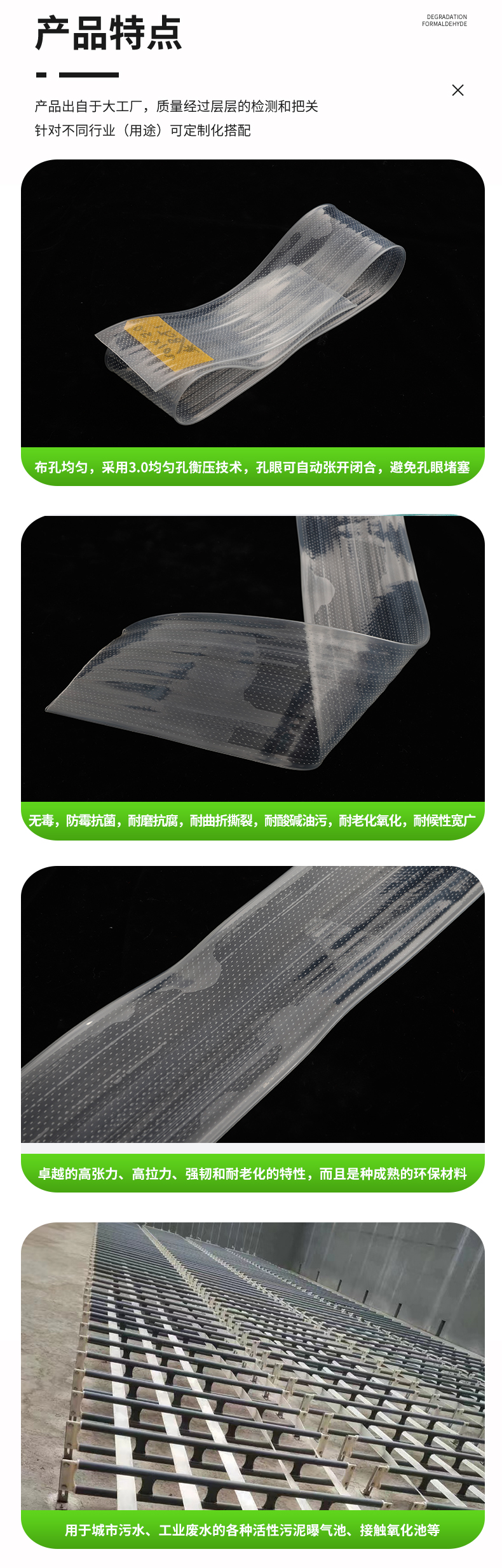 曝氣軟管是引進西德技術開發(fā)成功的新型增氧曝氣器。薄壁、直通道極大降低了曝氣阻力損失;可變孔及狹縫自動開閉,徹底解決了曝氣器的堵塞問題;軟管為線狀曝氣,使布氣均勻,并形成豎向環(huán)流,攪拌混合更均勻;氣泡小,氧利用率和動力效率高。
