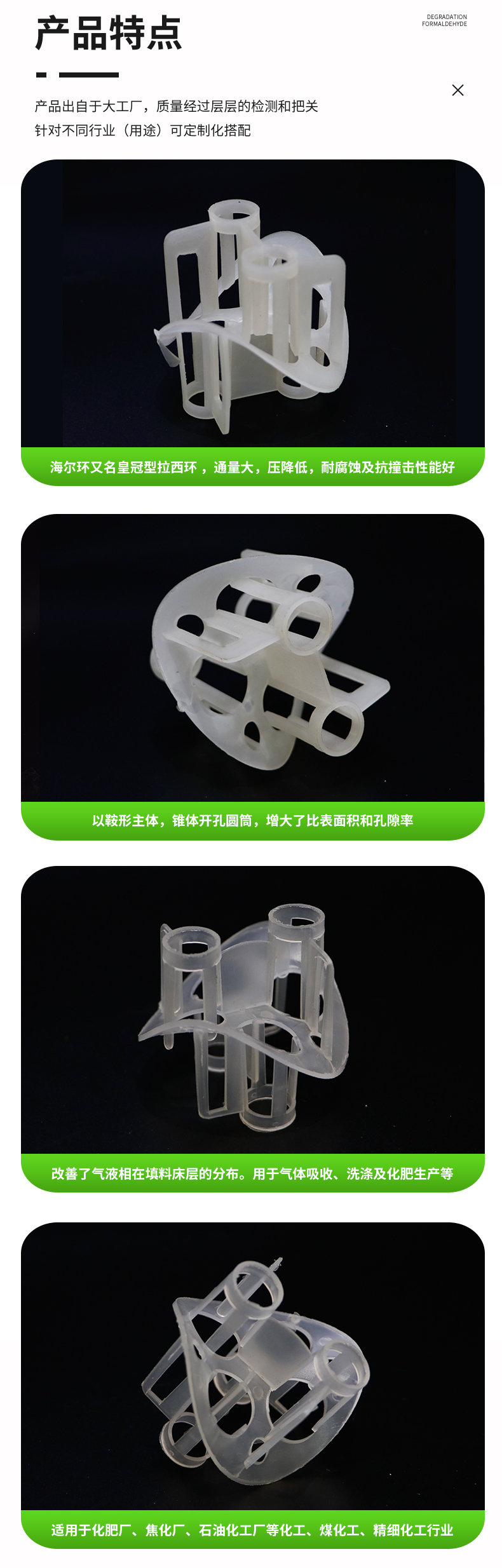 聚丙烯海爾環(huán)填料主要采用聚丙烯的化學(xué)穩(wěn)定性很好,除能被濃硫酸及濃硝酸侵蝕外,對(duì)其他各種化學(xué)試劑都比較穩(wěn)定,同時(shí)它的化學(xué)穩(wěn)定性隨結(jié)晶度的增加還有所提高。產(chǎn)品經(jīng)注塑成復(fù)雜結(jié)構(gòu)的優(yōu)點(diǎn),以鞍形為主體,錐體開(kāi)孔圓筒,增大了比表面積和孔隙率,改善了氣液在填料層的分布。產(chǎn)品具有低壓降、填料層氣液分布均勻,抗污性強(qiáng)。