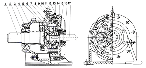 1.輸入軸2.擺線輪3.轉(zhuǎn)臂4.輸出軸5.針齒殼 |