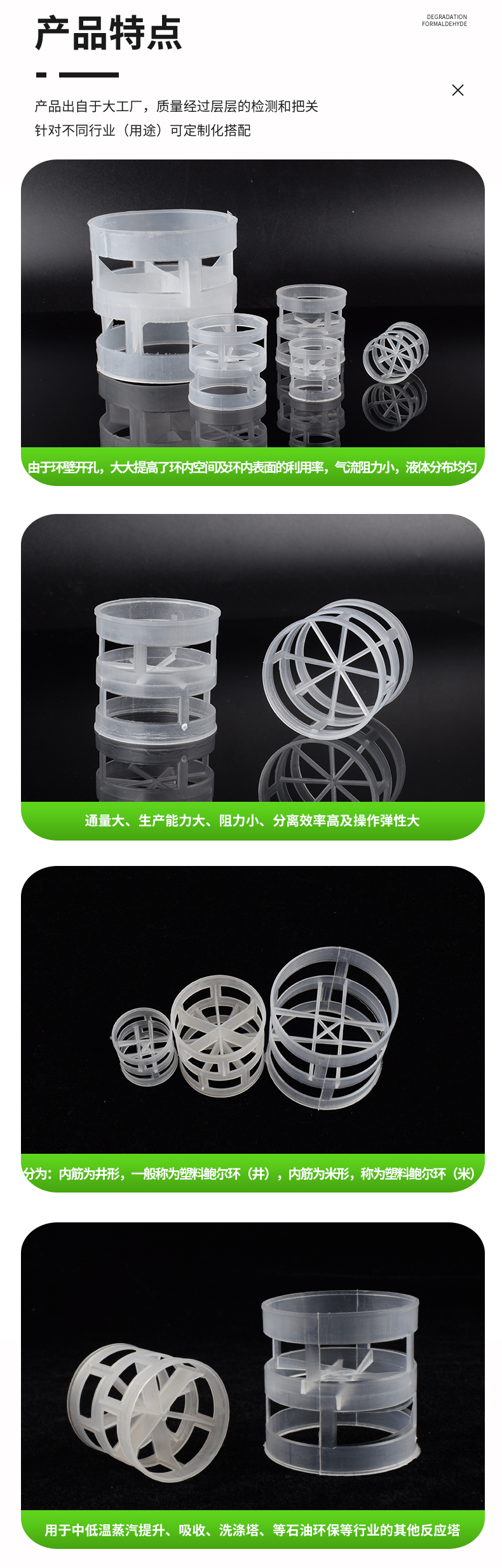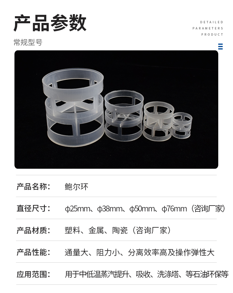 鮑爾環(huán)填料是采用金屬薄板沖扎制成,在環(huán)壁 上開(kāi)出了兩排帶有內(nèi)伸舌葉的窗孔,每排窗有五個(gè)舌葉彎入環(huán)內(nèi),指向環(huán)心,在中心處幾乎相搭,上下兩層窗孔的位置相互錯(cuò)開(kāi),一般開(kāi)孔的總面積約為整個(gè)環(huán)面積的35%左右。