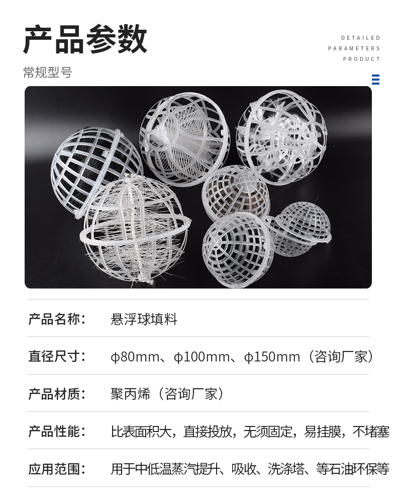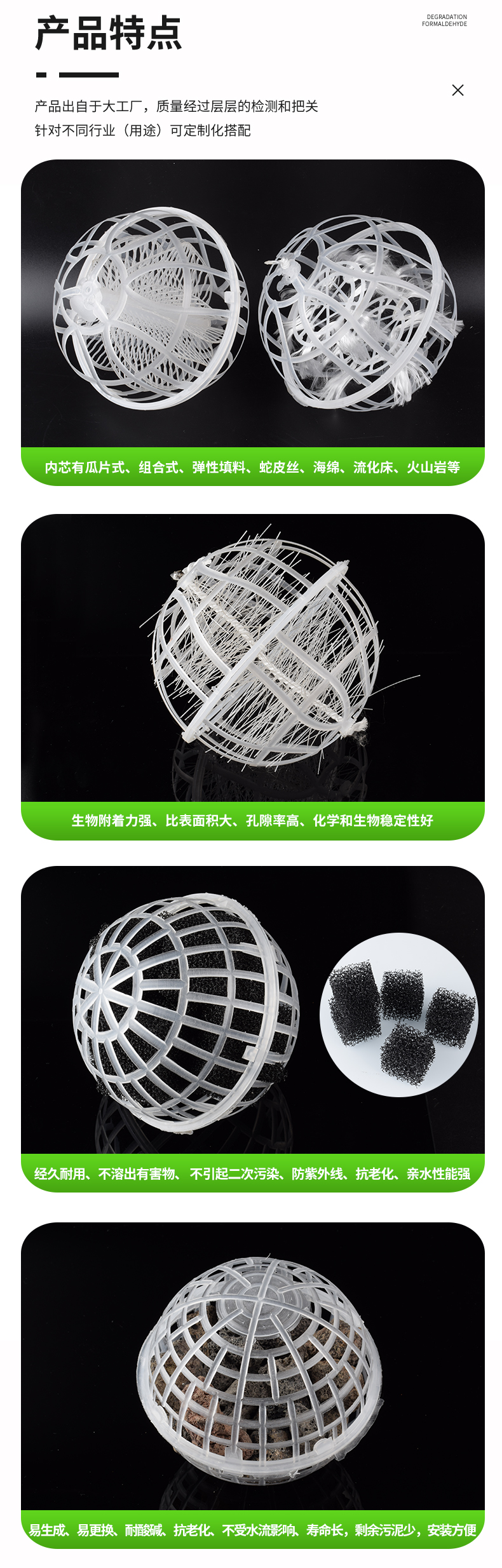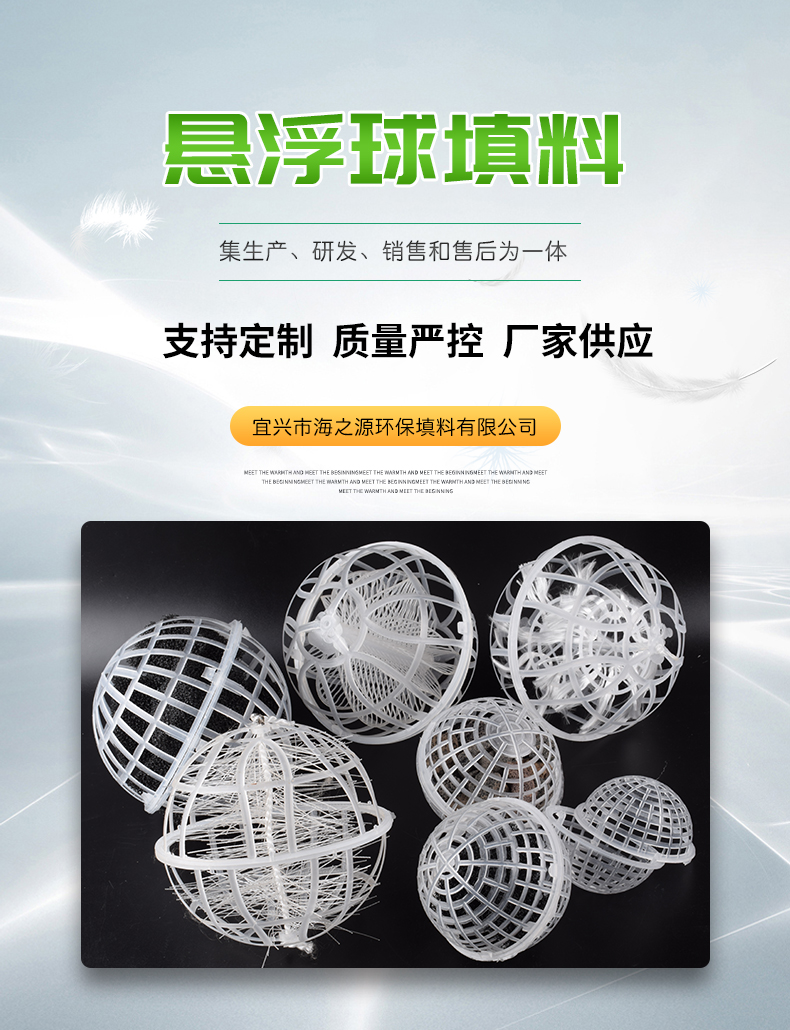 球形懸浮填料,又稱多孔旋轉(zhuǎn)球形懸浮填料,是對(duì)國(guó)內(nèi)處理污水、生物膜法處理技術(shù)采用的多種填料中開發(fā)的新系列產(chǎn)品。在污水的生化處理中具有全立體結(jié)構(gòu),比表面積大,直接投放,無(wú)須固定,易掛膜,不堵塞。