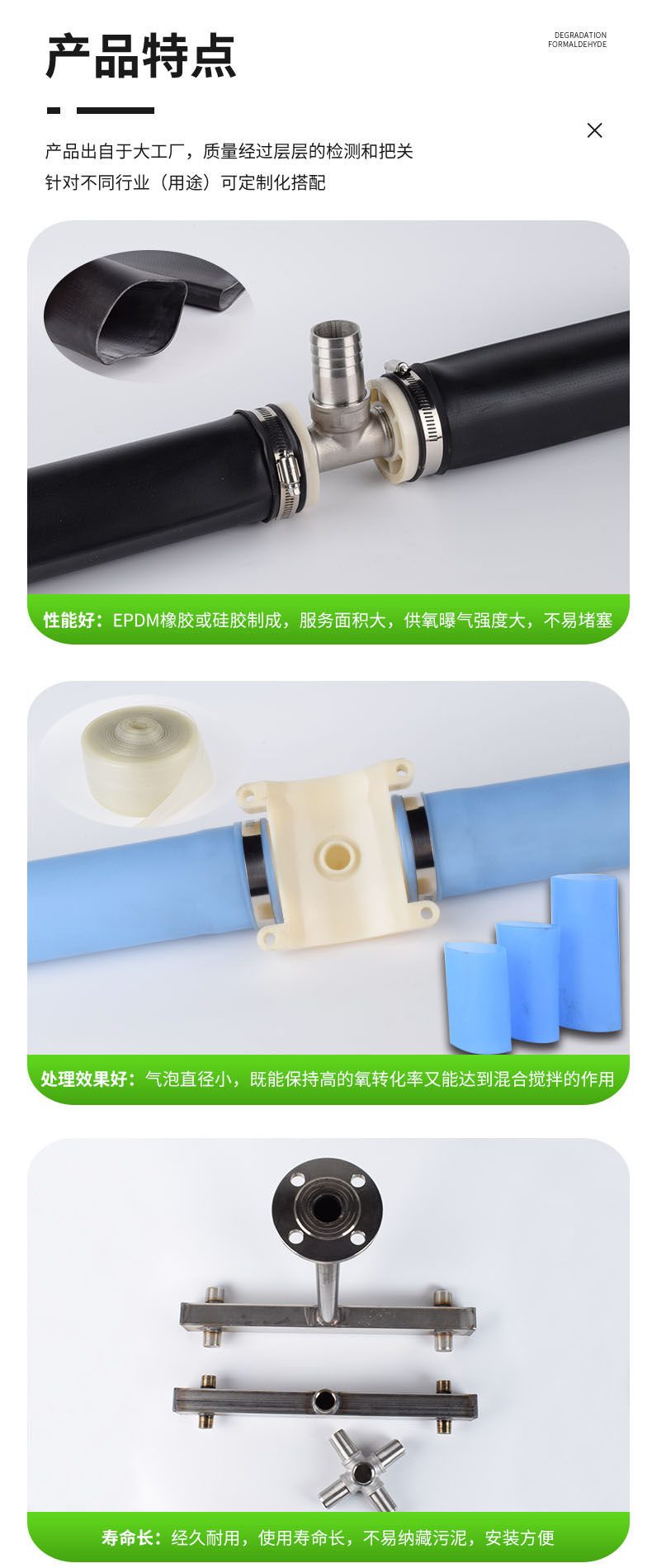 管式曝氣器構(gòu)造:曝氣膜片、支撐管、空氣管道。管式曝氣器外徑69mm,常規(guī)為580mm、800mm和1000mm。長度在580mm一下采用擠出或模壓成型,長度大于580mm采用擠出成型。膜管上一1.5mm大小、2×2.5mm的間距打孔,能產(chǎn)生直徑1-3mm的均勻微小氣泡膜管頂部有15mm長無氣孔區(qū),當(dāng)終斷供氣時膜片立即恢復(fù)原狀。對空氣入口起自動防逆流作用。