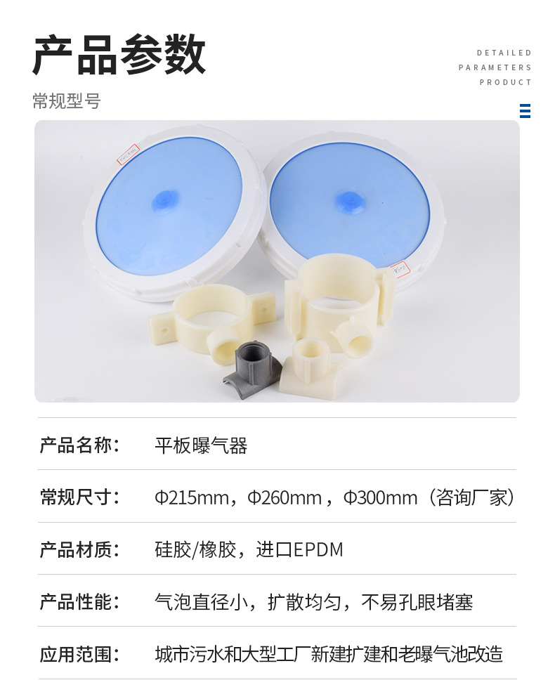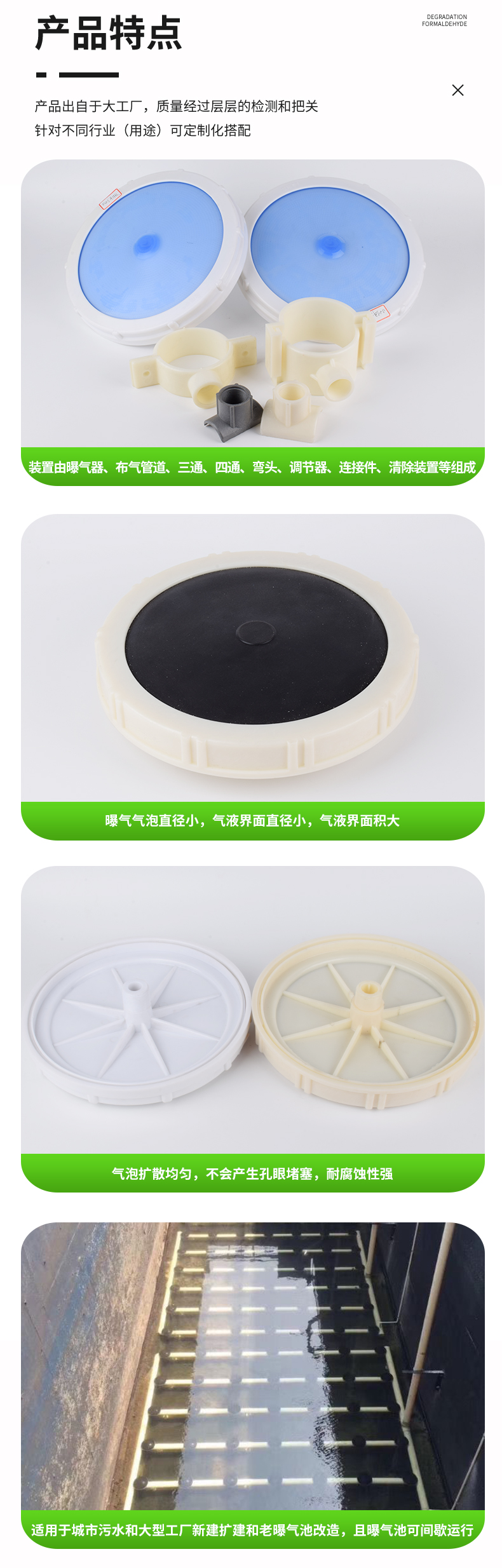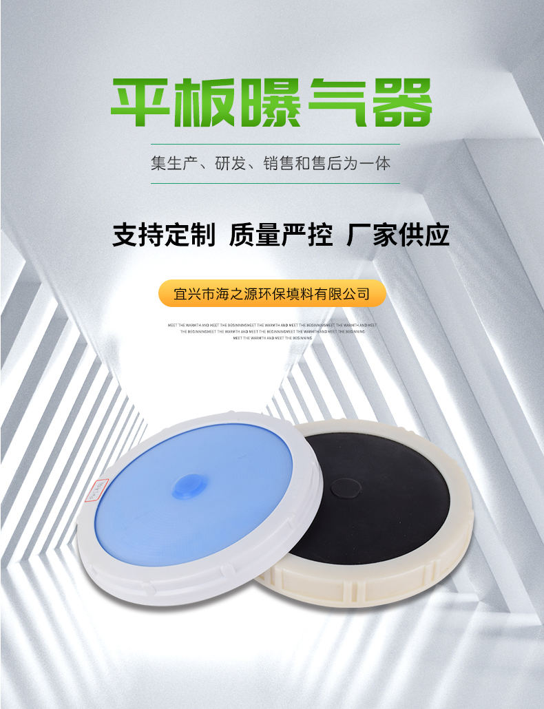 平板膜片曝氣器,該裝置曝氣氣泡直徑小,氣液界面直徑小,氣液界面積大,氣泡擴散均勻,不會產生孔眼堵塞,耐腐蝕性強,經上海同濟大學環(huán)境工程學院和中國市政工程華北設計院進行清水和污水充氧測試,并經50多家用戶多年使用效果良好(比常規(guī)產品固定螺旋曝氣器,散流曝氣器和穿孔管曝氣器能耗降低40%,或增加污水處理量40%)。特別適用于城市污水和大型工廠新建擴建和老曝氣池改造,且曝氣池可間歇運行。
