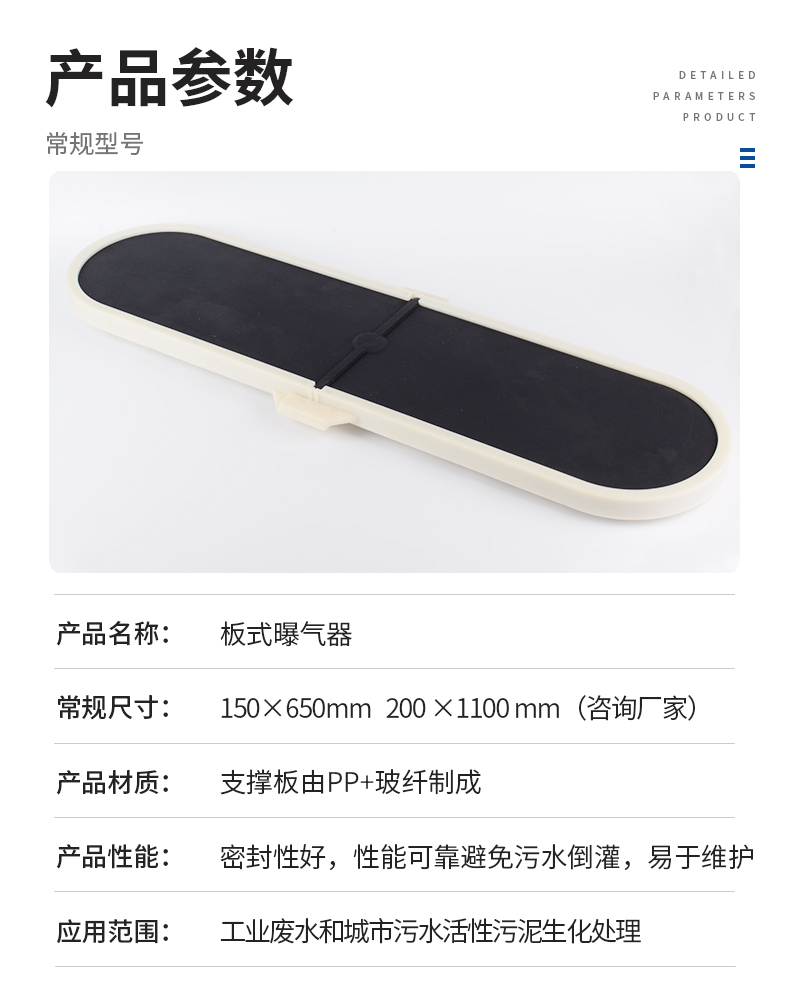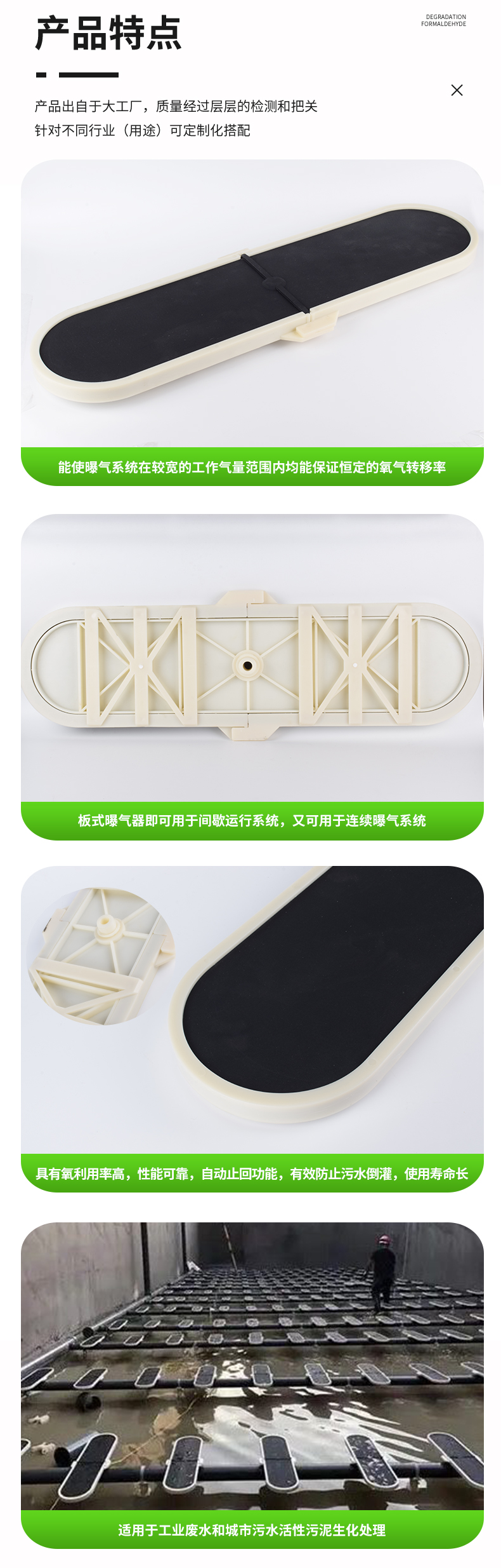板式曝氣器設(shè)計(jì)結(jié)構(gòu)使曝氣器系統(tǒng)在較寬的工作氣量范圍內(nèi)保持低能耗、高效率;開孔方式,在鼓風(fēng)機(jī)工作的過程中,曝氣器產(chǎn)生的氣泡均勻,達(dá)到很好的蓮花效應(yīng);該曝氣即可用于間歇運(yùn)行系統(tǒng),又可用于連續(xù)曝氣系統(tǒng),具有氧利用率高,性能可靠,曝氣器具有自動止回功能,有效防止污水倒灌,使用壽命長等特點(diǎn)。