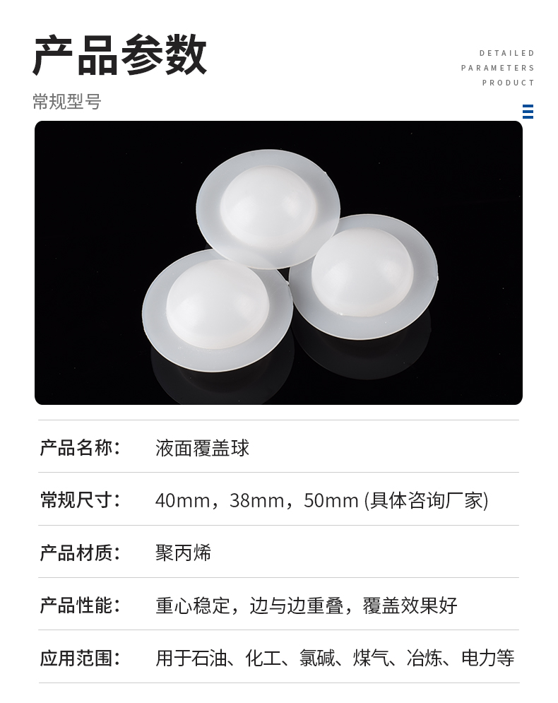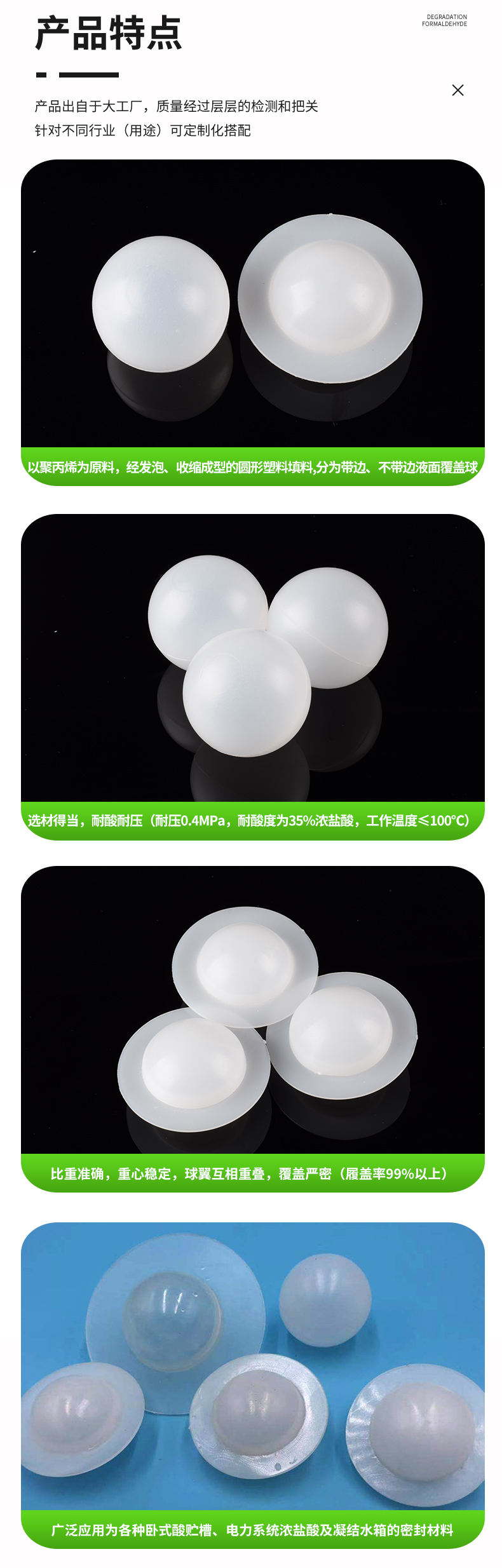 液位蓋球的灌裝產(chǎn)品有兩種:一型為發(fā)泡球,二型為發(fā)泡實(shí)心球(節(jié)能球),適用于水處理中的各種臥式酸儲(chǔ)罐、冷凝液儲(chǔ)罐、軟化水儲(chǔ)罐,大大減少酸霧空氣中的一氧化碳和氧氣對(duì)水質(zhì)的污染,保護(hù)水質(zhì),節(jié)能凈化環(huán)境。
