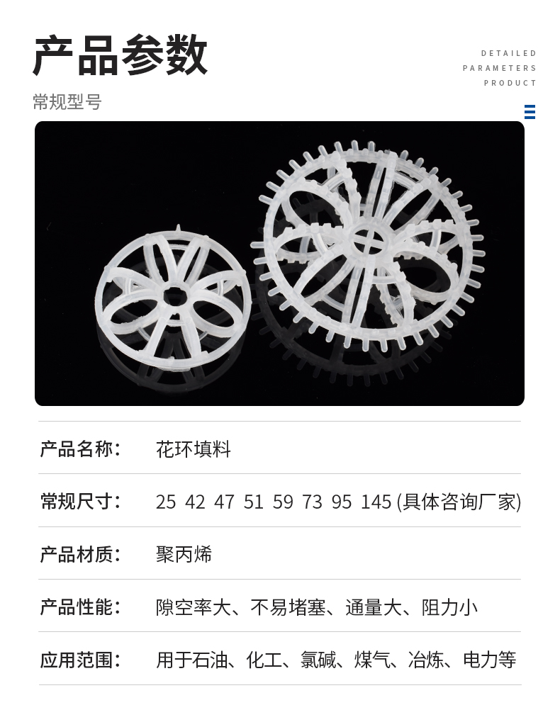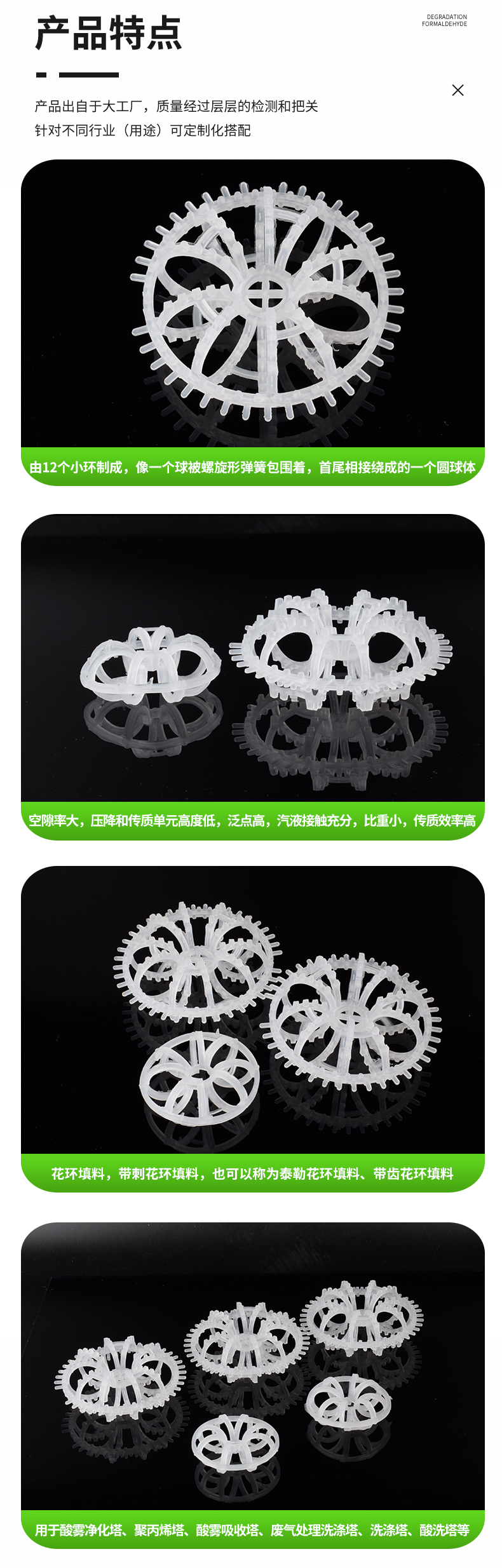 花環(huán)填料也稱梅花環(huán)填料是由許多圓環(huán)結(jié)繞而成,由于這種填料的間隙處能有較高的滯液量,可使塔內(nèi)液體停留時(shí)間較長(zhǎng),從而增加了氣液的接觸時(shí)間,提高了填料的傳質(zhì)效率。具有空隙率大,壓降和傳質(zhì)單元高度低,泛點(diǎn)高,汽液接觸充分,比重小,傳質(zhì)效率高等特點(diǎn),多用于氣體洗滌、凈化塔中。